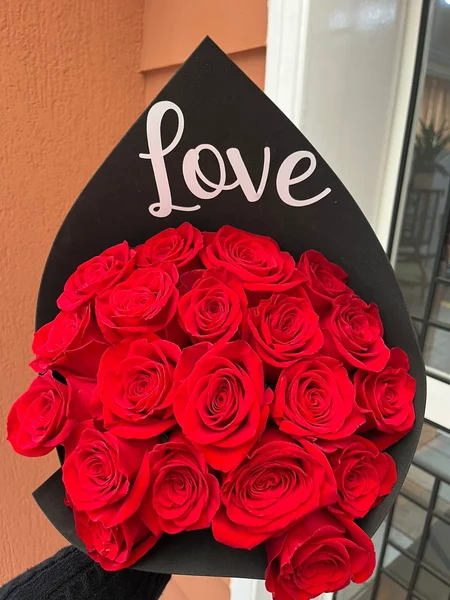 Buque de 20 rosas vermelhas. Envolvido na cartolina preta. Personalizado LOVE