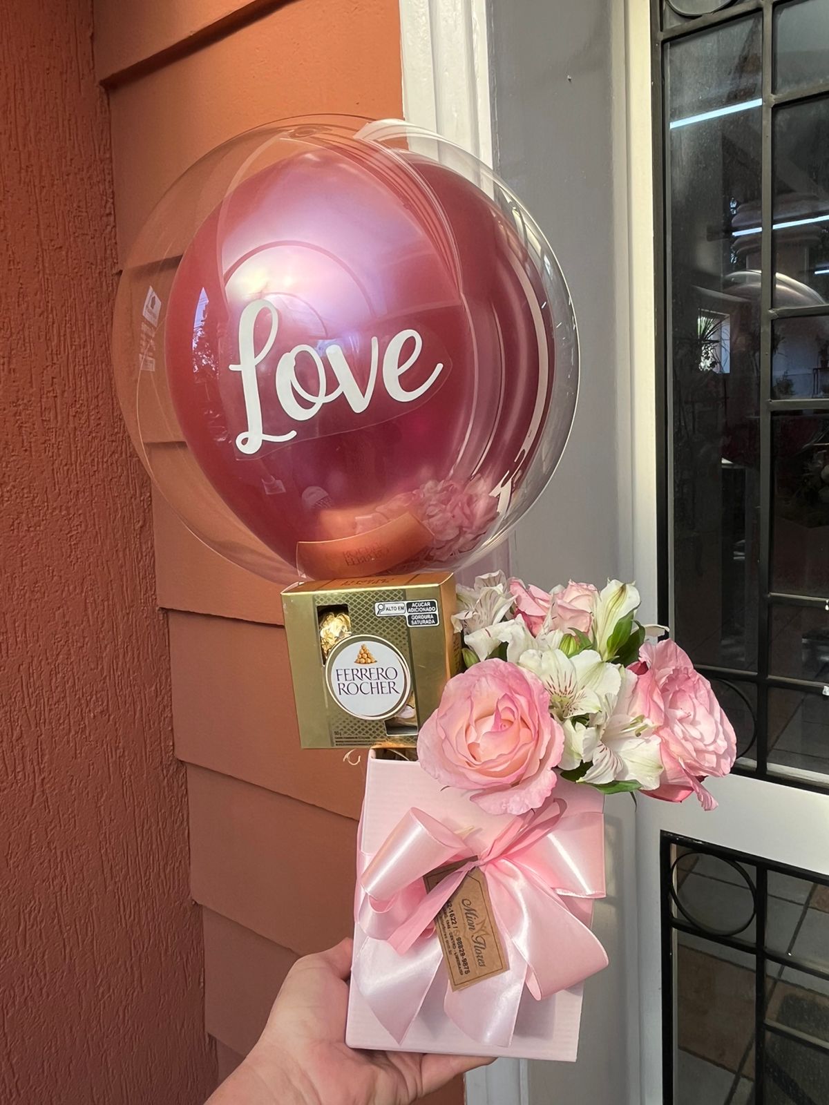CAIXA ROSA, COM ARRANJO DE ROSAS, FERRERO ROCHER E ADICIONAL DE BALÃO ROSA