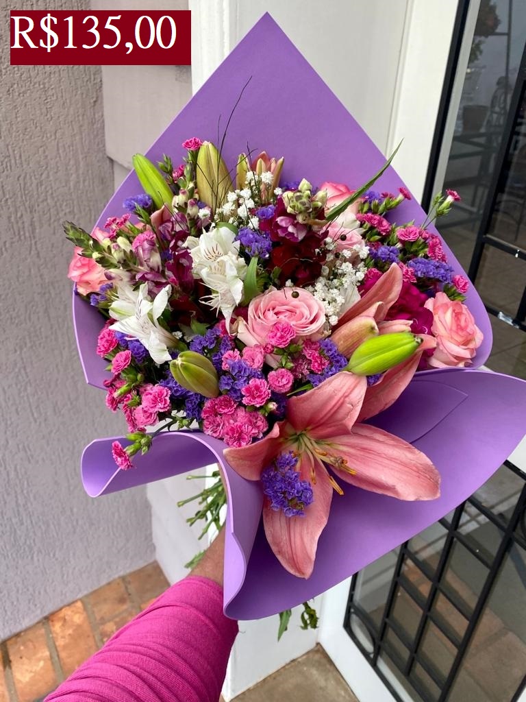 BUQUET COMPOSTO POR MIX DE FLORES, ENVOLVIDO EM EVA LILAS