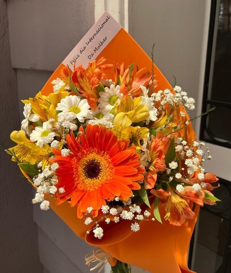 BUQUE COMPOSTO POR FLORES DO CAMPO EM TONS LARANJA E BRANCO, EVOLVIDO NO EVA LARANJA