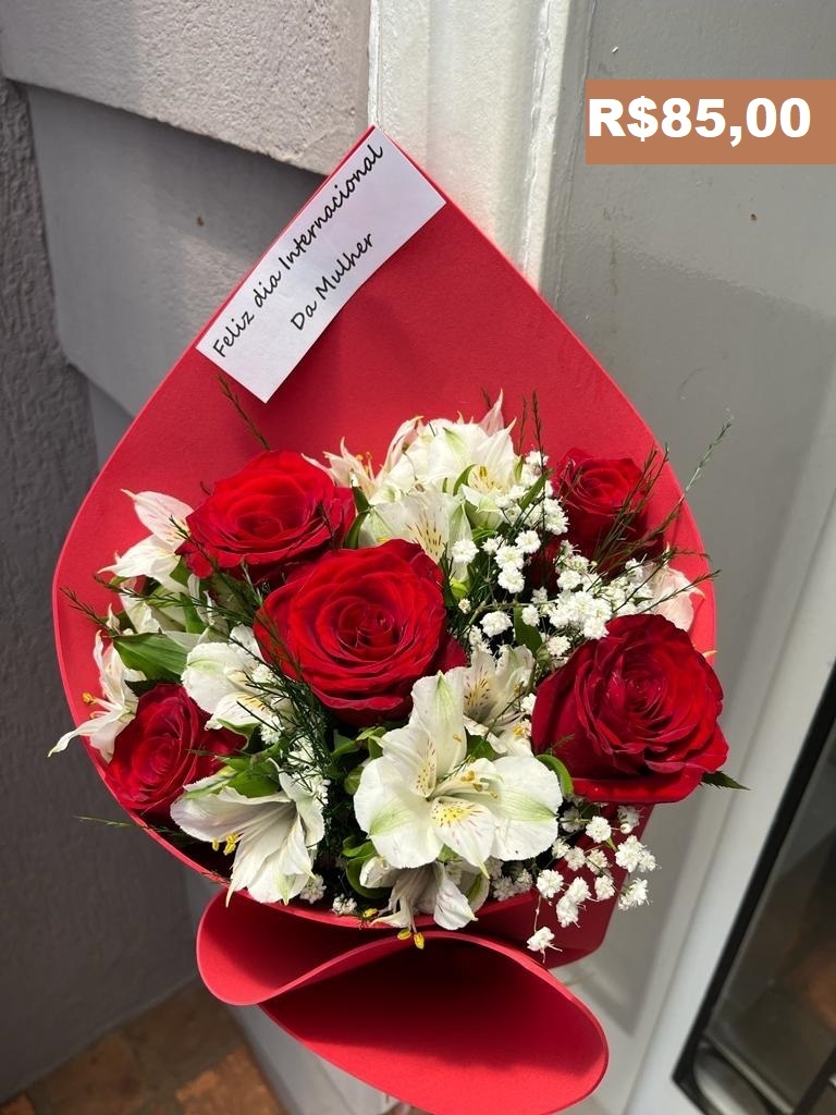 BUQUE COMPOSTO POR 5 ROSAS VERMELHAS E FLORES BRANCAS. ENVOLVIDO NO EVA VERMELHO
