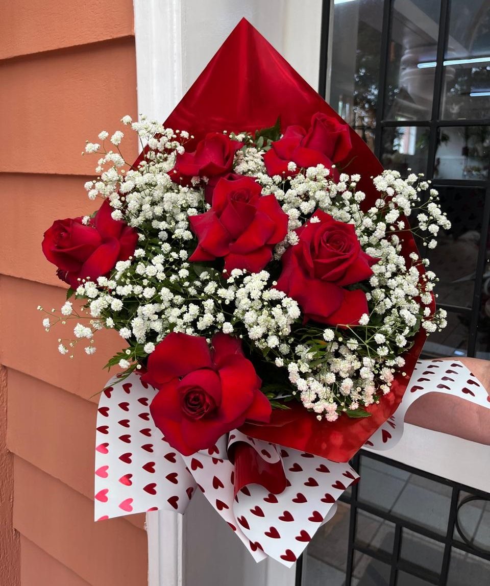 Ramalhete Tradicional com 06 rosas vermelhas mais mosquitinho. Envolvido em papel de coraçãozinho